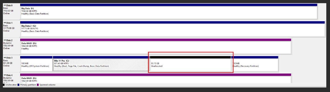 In Disk Management, locate your primary drive and inspect the graph shown of its available and unavailable space; you will likely see a grey section that is "Unallocated':